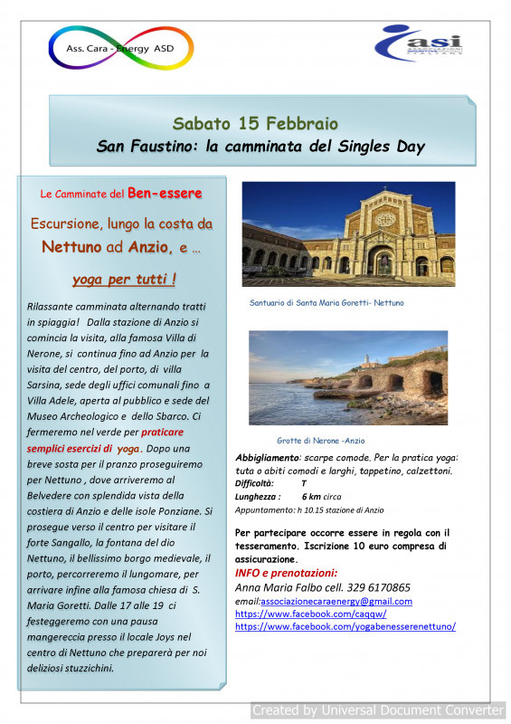 L’associazione Cara Energy, la cui delegata per il Lazio è la stessa Anna Maria Falbo, non poteva dimenticarsi della “sua creatura, il Single Day”, ma in un’ottica diversa rispetto al passato. I singles sono sempre più attenti alla propria salute e al proprio benessere e pertanto ha organizzato per sabato 15 febbraio “ La camminata del Singles Day” da Anzio a Nettuno, una rilassante camminata con visita alla cittadina di Anzio e alle sue famose ville, pratiche di Yoga durante la mattinata, dopo il pranzo a sacco si prosegue verso Nettuno e infine una meritata sosta “mangereccia” con appetitosi stuzzichini in un locale di Nettuno per chiudere la giornata. Un modo alternativo e salutistico per “volersi bene” e festeggiarsi in piacevole compagnia.