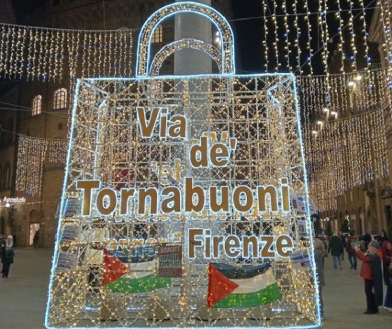 A Firenze Un gruppo di attivisti di “Firenze per la Palestina” ha trasformato via Tornabuoni, cuore dello shopping fiorentino, in un palcoscenico di protesta con un flash mob natalizio. Al centro dell’azione, una shopping bag gigante decorata con lucine festive, su cui spiccava lo slogan “Il nostro Natale finanzia il genocidio”.