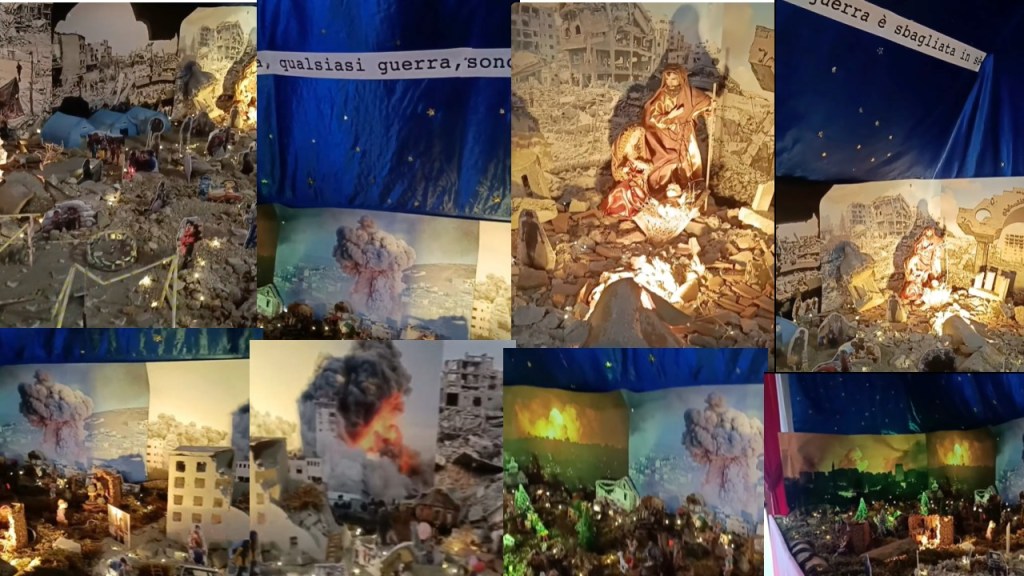 A Monte Sant’Angelo, provincia di Foggia Al posto delle classiche statuine ci sono scene di vita quotidiana nelle località colpite dalle guerre, per un appello a costruire la pace anche in mezzo al caos dei recenti conflitti